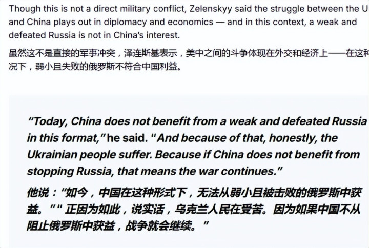 “我不认为给俄乌冲突画上休止符对中国有利。中国不希望看到俄罗斯衰弱和战败。而乌克兰人民正因此深受其害。如果中国不希望阻止俄罗斯,那就意味着战争会继续。这并不是说中国直接为俄罗斯提供了武器支援,但它肯定不支持结束这场战争。”
